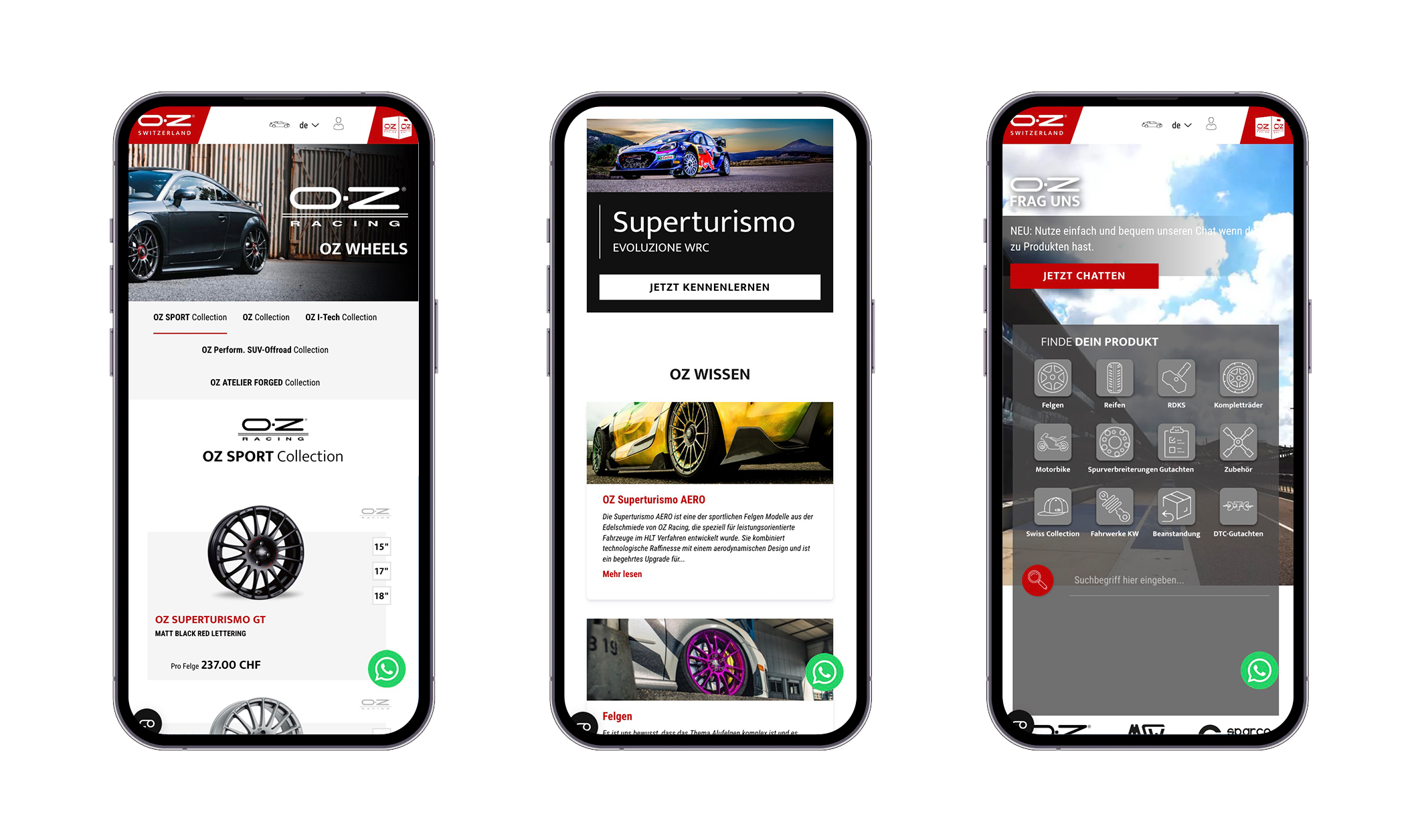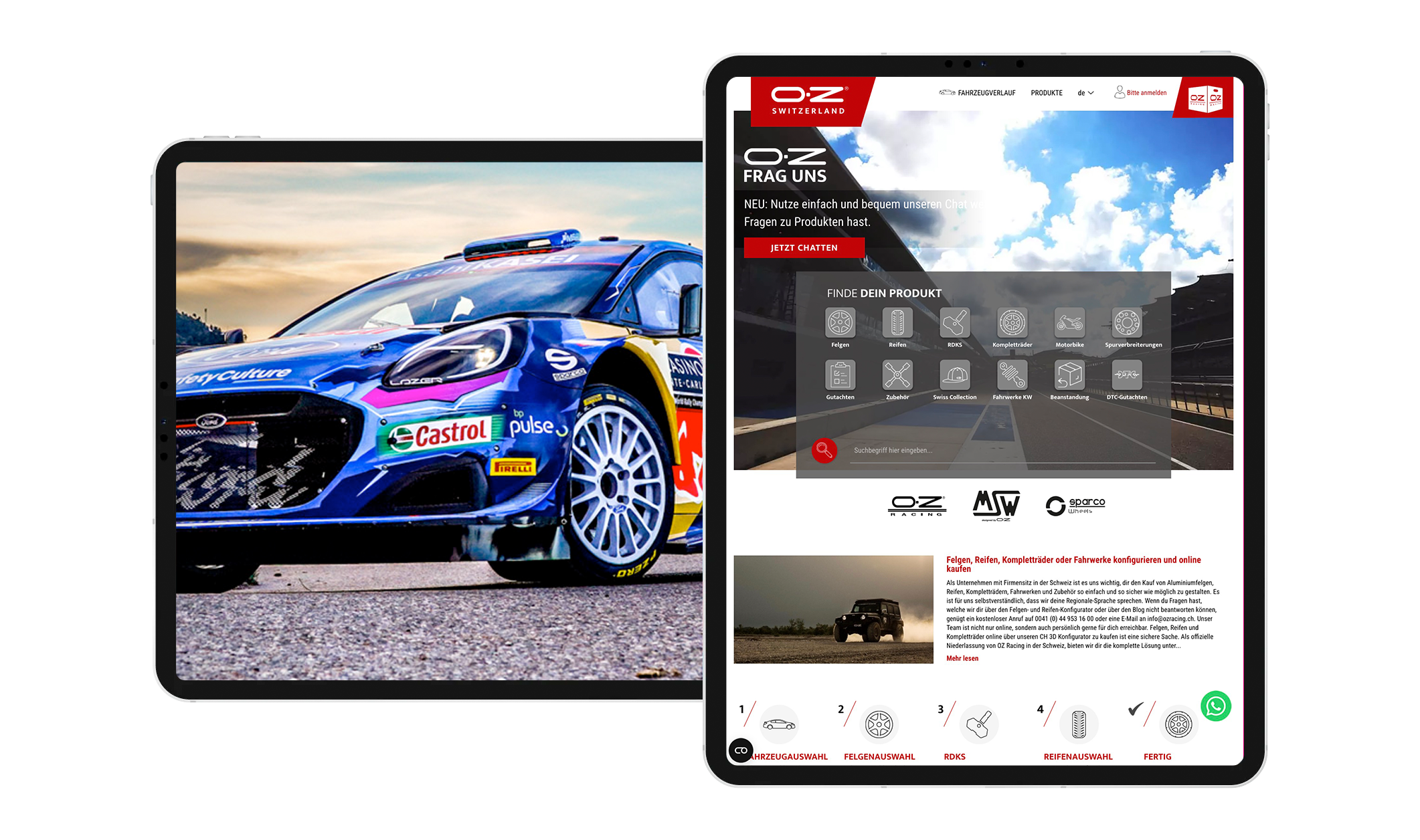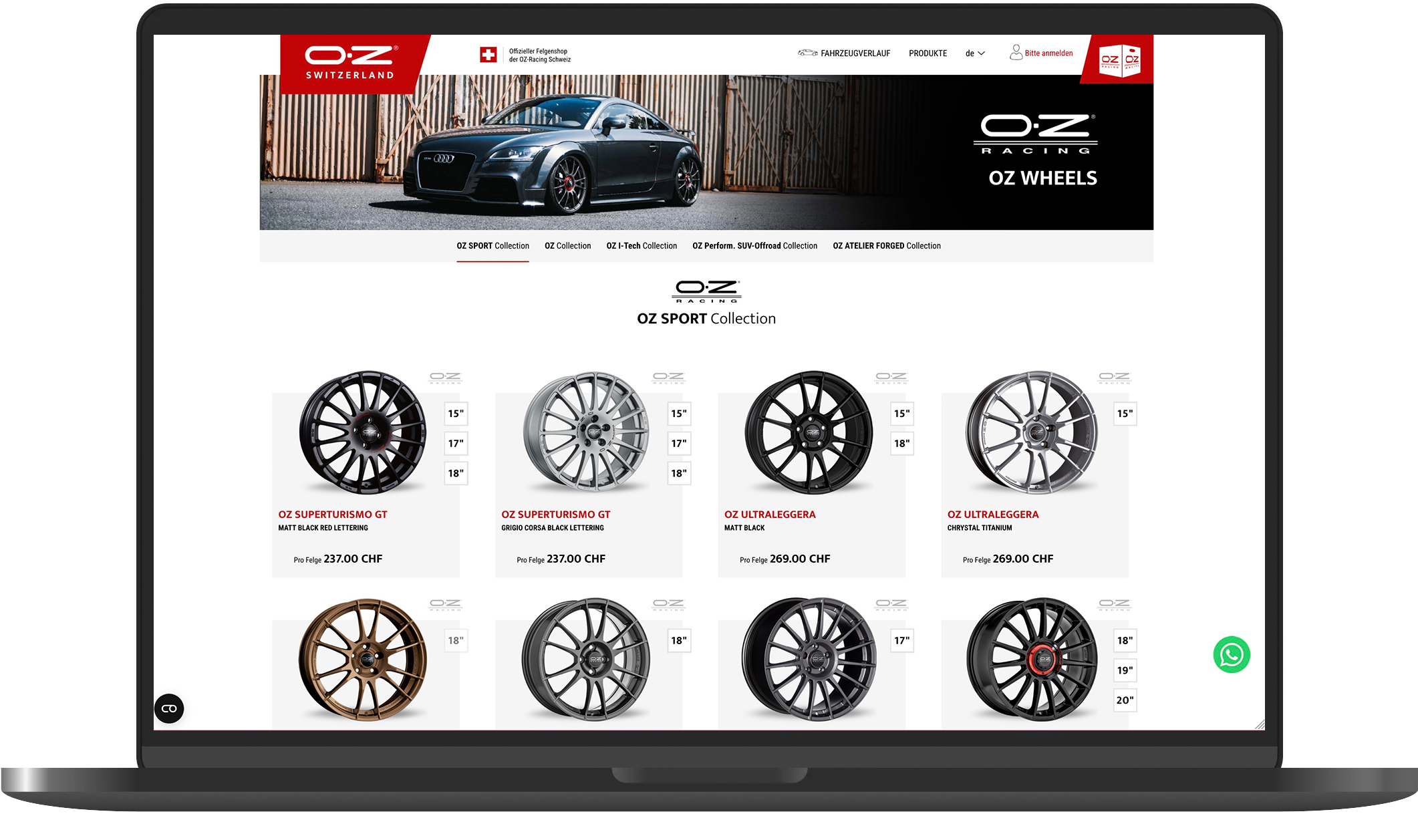 Unser Team hat den offiziellen Schweizer O.Z Onlineshop ins Leben gerufen – mit einem Felgenkonfigurator, der die Herzen aller Autoliebhaber höher schlagen lässt. Adobe Commerce (Magento 2) vereint externe Daten und individuelle Produktinfos zu einem Einkaufserlebnis, das Emotionen weckt und keine Wünsche offenlässt.